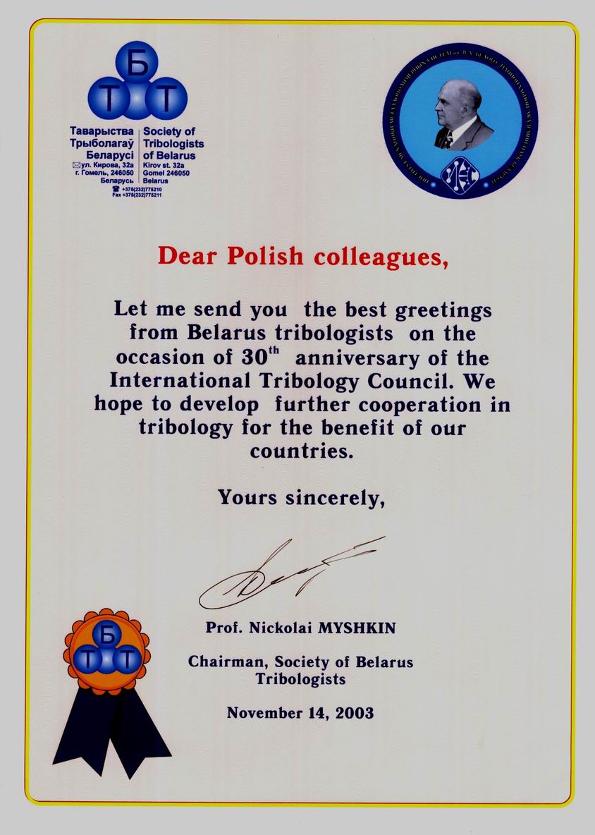 Koledzy z Białoruskiego Towarzystwa Tribologicznego V. Savitsky, V. Sergienko wręczyli dyplom pamiątkowy dla PTT