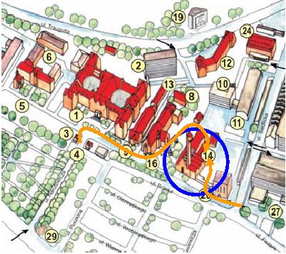 Trasy dojścia od głównego i bocznego wejścia zaznaczone są pomarańczowymi strzałkami