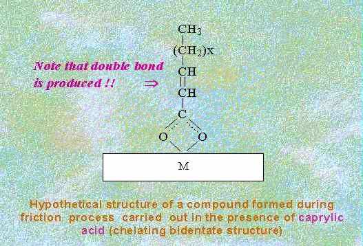 Another paper [29] related to some wear issues and a general degradation mechanism of fluorinated compounds. Most recently, Przedlacki et al. [30] described both tribochemical performance and lubrication mechanism of selected fluorinated alcohols containing 5 to 10 carbon atoms. The experiments were performed on an Optimol SRV tester with steel/steel and steel/Al contacts under boundary lubrication conditions. The products of the tribochemical reactions were investigated using FTIRMA, XPS and SEM/EDS techniques. An application of the NIRAM approach was proposed for the reaction path and structure of an oligomeric film formed by fluorinated alcohols under friction conditions. It was demonstrated that alcohols form anions or anion-radicals which in turn react with positively charged metal surface spots. In the case of the investigated fluorinated alcohols the process may proceed in two steps. The first step is the interaction between lubricant molecules and low-energy-electrons. The second is the reaction of anions and anion-radicals with positively charged surface followed by cross-linking between unsaturated anions and anion-radicals reacting with the surface, leading to an oligomeric organo-metallic layer which protects the surface. Tribochemistry of alcohols, fatty acids, esters, ethers and hydrocarbons was recently discussed in [31]. Majzner et al. [32], investigating tribochemical reactions of carboxylic acids under boundary friction conditions found that, apart from monodentate carboxylate group, salts with double bond in a, b position and chelating symmetric bidentate carboxylate group are formed. These results do not exclude the possibility that under boundary friction conditions carboxylic acids react on steel surface according to negative-ion-radical action mechanism. Figure 4 shows the proposed structure of iron salt with double bonding. Such compounds were not detected after reactions taking place under static conditions. This also clearly shows the difference between tribochemical and thermochemical reactions.
