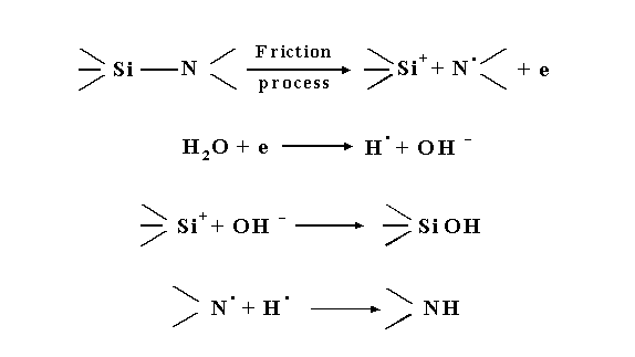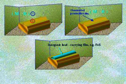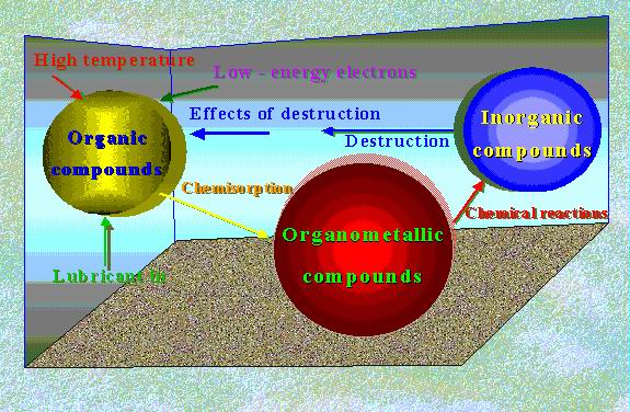 Due to action of the emitted electrons with the lubricant molecules, negative ions and radicals are produced on the rubbing surfaces. Interaction of negative ions with a solid surface leads to the formation of a chemisorbed protective film (organometallic film) which protects the rubbing surfaces from wear. If shear strength is high, it can cause cleavage of chemical bonds producing an inorganic film, for example iron sulfide, and generating further radicals followed by adequate chemical reactions.