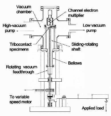 TRIBOEMISSION APPARATUSA new high-vacuum triboemission instrument - that is based on a Channel-Electron Multiplier (CEM) in the pulse-counting mode - was designed, constructed and employed for the following presented measurements of charge intensity. The new triboemission instrument features a rotating-sliding shaft which introduces the mechanical inputs into a high-vacuum chamber. A wide range of loads can be applied to the shaft by a weight and fulcrum. Also, a variable-speed electric motor can produce a wide range of rotational speeds. A biased-grid is placed between the emitting surfaces and the detector. A schematic diagram of the triboemission device is shown in Figure 8. Detailed descriptions of the triboemission instrument's features, operating ranges and measurement and data acquisition capabilities were presented in the work of Molina et al [33-35]. Figure 8a shows a photograph of the triboemission set-up.