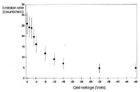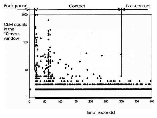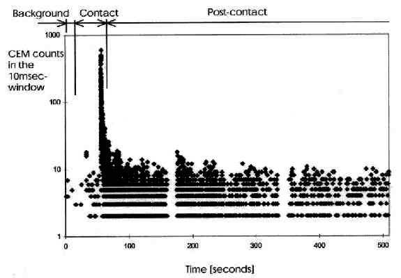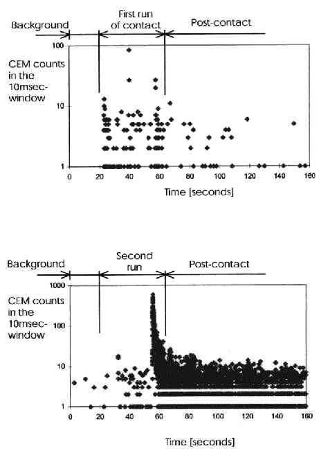 The CEM-counting in the 10 msec acquisition-window (each count representing a single particle of enough energy to reach the detector) shows burst-type emission significantly higher than background-noise. Decaying emission, though of lower level, is also observed after the contact ceased. Measurements of triboemission also were performed from alumina-ball on alumina-disk systems. A typical measurement of triboemission from alumina-on-alumina during contact and the post-contact emission is shown in Figure 10. Applied load was 2 N and the employed sliding speed was 0.14 cm/second during a 45second contact-period, after which contact ceased. The gaps of data acquisition in Figure 11 correspond to periods where data acquisition was set off to save acquired data at the employed acquisition rate of 10msecond-window.