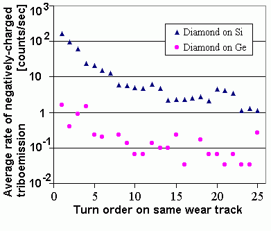 REVIEW OF SOME EXPERIMENTAL RESULTSMain research work by the authors allowed to find significant emission of electrons from diamond-on-alumina, diamond-on-sapphire and alumina-on-alumina during sliding contact and after contact ceased, while no emission was detected from diamond-on-aluminum systems. Most recent research [38] was focused on negative-charge intensity from the semiconductors silicon and germanium while scratched by a diamond pin in high vacuum. In these experiments significant triboemission was always detected during the sliding contact, while emission was undetectable when contact ended. Emission intensity was substantially higher for diamond-on-Si than for diamond-on-Ge. Decreasing emission was observed when the same wear track was scratched in repeated passes.