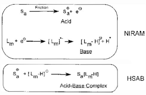 (a) Average rates for two different wear-tracks on same specimen in 120 sec-contact (four turns). Load: 5 N. Speed:1-1.9 mm/s. (b) Average rates for different specimens in 320 sec-contact. Load: 2-5N. Speed: 1.4-4.8 mm/s. (c) For differences between average triboemission count and CEM background. Sample size: 2 (3 for alumina-on-alumina). Molina et al. [38] presented the first-known evidence that negative-charges are emitted from diamond-on-Si and diamond-on-Ge during sliding contact. This burst-type electron emission is not substantially different from those shown in diamond-on-insulators sliding. A significant difference was found between triboemission rates from diamond-on-Si and diamond-on-Ge, and the possibility is discussed that such difference relates to the material hardness. Decreasing triboemission is also observed from the semiconductors when the same wear track is scratched in repeated passes, and such decreasing triboemission may relate to decreasing semiconductor wear. Clear evidence for a new finding is presented that no emission is produced after the contact ceased for these semiconductors, while post-contact triboemission was previously detected for an insulator (e.g., alumina) under vacuum. NIRAM - HSAB Concept of Ceramic TribochemistryThe concept is based upon the ionization mechanism of ceramic lubricant compound molecules caused by the action of exoelectrons. As already mentioned before, the principal thesis of the model is that lubricant components form anions which are then chemisorbed on the positively charged areas of rubbing surfaces. Paper [47] presents a generalized NIRAM - Hard and Soft Acids and Bases (HSAB) theory and provides its possible application for accounting for some tribochemical processes under boundary conditions. The approach combines reactivity of lubricant components and tribological solids according to reactions induced by low-energy electrons and reactions affected by acid-base interaction. Major HSAB interactions are related to tribochemical reactions, initiated by low energy electrons. Figure 14 depicts a general approach to the NIRAM - HSAB action mechanism.