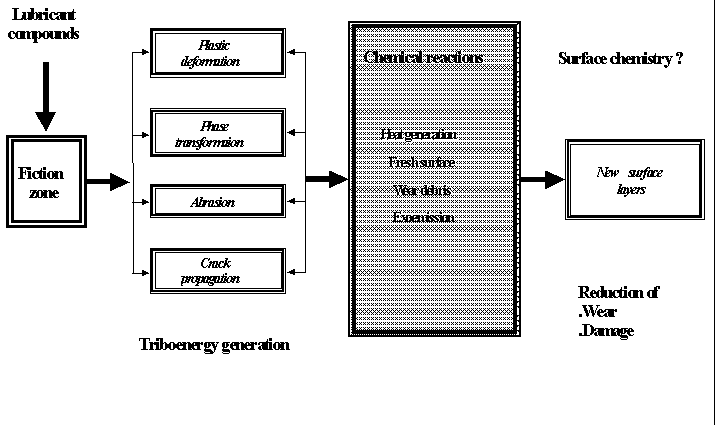 the influence of boundary and/or mixed lubrication operating conditions. From the view-point of chemical reactions at surfaces, a very comprehensive review of mechanically initiated reactions is described in [1]. It is stressed that many tribological problems are concerned with various tribochemical reactions that cannot be accounted for by frictional heat alone. Another review [2] emphasizes the technological importance of the mechanical initiation of chemical reactions in such processes as grinding, drilling, crushing and cutting which are often facilitated by chemical compound formation at the worked interface. Tribochemical reactions are distinct from those of thermochemical ones because activation energy (Ea) for the latter is much higher. For example, Ea for iron oxide formation from iron and oxygen differs very significantly if the thermochemical reaction (Ea=54 kJ/mol) is compared with tribochemical reaction (Ea=0.7 kJ/mol) [1]. Similar dependence may be observed for other reactions. The occurrence of reaction velocity independent of temperature shows clearly that the energy for releasing the reactions is applied to the solid through the mechanically activated regions only. The same is due to catalysis and tribocatalysis. It is to note at this point that chemically stimulated exoelectron emission occurs continuosly from silver catalyst during partial oxidation of ethylene and the emission rate is proportional to the rate of ethylene oxide formation [3]. The central thrust of this paper is to review and discuss a wide variety of tribological experimental results relating to metals, ceramics as well as diamond-like carbon (DLC). It aims mostly at answering some specific questions concerning both tribochemistry and catalysis. Additional objective of the present paper is to look for links between tribochemistry and tribocatalysis in terms of the NIRAM concept. 2 BOUNDARY LUBRICATION AND TRIBOCHEMISTRYAn excellent and detailed review of the boundary lubrication history is described by Dowson [4]. Boundary lubrication is quite complex and even difficult to be clearly defined. However, it is an extremely interesting research area due to still existing many unknowns, even in respect to the anti-wear behaviour of fatty acids and/or tribochemistry of fatty alcohols and esters. Boundary lubrication is often described as a condition of lubrication, in which the friction and wear between two surfaces in relative motion are determined by the properties of the surfaces and by the properties of the lubricant other than viscosity. This definition is closely related to the Hardy's first approach to the boundary lubrication process [5]. Taking into account what Campbell [6] wrote 30 years ago, one can note that not too much better understanding of the boundary lubrication complexity was gained in this period. He emphasized that boundary lubrication is perhaps the most confusing and complex aspect of the subject of friction and wear prevention. This statement might consider the fact that what is known mostly relate to the friction coefficient.When oxides of the contact area are thick and porous they are ruptured easily. That results in both plastic deformation of the sliding surfaces and a wide variety of physical phenomena, particularly those related to the triboemission process. Disruption of the surface oxide layer generally results in some physical processes and usually in higher friction and severe wear. The wear debris produced are entrapped at the interface and plowing and microcutting of the surfaces occurs. During these interactions (a) forces are transmitted, (b) energy is consumed, (c) physical and chemical natures of these materials are changed, and (d) the surface topography is altered. Understanding the nature of these interactions is addressed to tribophysics [7] which describes the basic mechanisms that govern interfacial behavior and illustrate how the basic theories can be applied to provide practical solutions to important friction and wear problems. Physics and chemistry of tribological wear has been discussed in [8]. The formation of fresh surface sites forms a real bridge between physics and chemistry of the wear processes leading to microscopic aspects of a wide variety of wear mechanisms. These mechanisms are often connected with tribochemical reactions that are initiated by the surface enlargement effects. Typical physical phenomena evolved by wearing processes encompass mostly high temperature and triboemission. Detailed information concerning the triboemission process and related phenomena are described in [9]. Triboemission is defined as emission of electrons, charged particles, lattice components, photons, etc., under conditions of boundary friction conditions and/or surface damage caused by fracture processes. Figure 2 illustrates the triboemission process connected with the surface enlargement during friction.