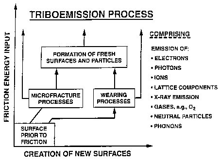 One of the most important component of triboemitted particles encompasses electrons. Accordigly, the triboemission process is of particular significance for both the boundary friction process as such and tribochemistry of the boundary lubrication process. 3 BASIC INFROMATION ON THE NIRAM APPROACH3.1 General DescriptionUnder rubbing conditions two types of activated sites on friction surfaces can be created, that is, thermally activated sites and sites activated by the exoelectron emission (EEE) process. Exoelectrons are electrons of low-energy (0 - 4 eV) spontaneously emitted from most fresh surfaces, or they are electrons that are emitted from surface atoms under certain conditions that provide enough energy to provoke their evaporation. Apart from low-energy electrons other particle types, mostly, ions and lattice components, are also emitted from solids during rubbing process as depicted in Figure 2. The formation of negative ions and their decomposition process are simulated by electron attachment mass spectrography [10]. This type of mass spectrography uses electrons of an energy range similar to those of exoelectrons (1 - 4 eV). Accordingly, the energy of triboelectrons (exoelectrons) is sufficient to form negative ions or negative-ion-radicals of a wide variety of compounds which, in turn, as reactive intermediates, may easily react with the positively charged surface sites of the friction solid (metal, ceramic, DLC, composite) counterparts, yielding given chemical compounds. Figure 3 presents schematically the triboelectron emission process.