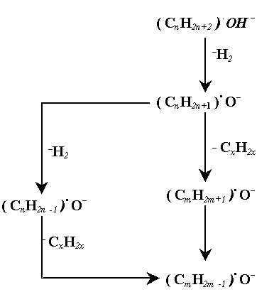 which corresponds to the strong signal found in the negative-ion mass spectrum of the Demnum S200 lubricant (Figure 4). Although the catalytic degradation mechanism is widely accepted in the literature -- basing on a wide variety of discussed experimental data -- it is reasonable to emphasize that anionic intermediates (negative ions and/or negative-ion-radical species) produced by low-energy electrons play an important part in the electron mediated degradation process of PFPE lubricants. This is in line with the negative-ion-radical action mechanism (NIRAM) approach. This approach is evidenced somehow by elucidating the formation mechanism of the negative ion (m/e) = 163 from the negative-ion-radical species ?(m/e).- = 182. 4 TRIBOCHEMISTRY OF ALIPHATIC HYDROCARBONS4.1 General RemarksImportant compounds of mineral base oils and some synthetic ones, e.g., poly-a-olefin oils, relate to aliphatic hydrocarbons. Hexadecane (n-C16H34), also known as cetane, is widely used as the low-viscosity model base oil to investigate both tribological effectiveness and tribochemical reaction mechanisms of various antiwear and extreme pressure additives, as well as friction modifiers. It is a non-polar compound and thus does not compete with tribological additives on the surface adsorption process. Generally, it is accepted that freshly purified hexadecane is far poorer lubricant than material which has stood for some time, particularly in a transparent glass bottle. Early work on chemistry of boundary lubrication of steel by hydrocarbons demonstrated that the sliding behaviour of steel lubricated by hydrocarbons under boundary lubrication conditions could be related to chemical reactions at the sliding surfaces involving metal, hydrocarbon, and oxygen. The results suggested that the reactions occur at sites where fresh metal surface was exposed by rubbing. Most recent study [22] clearly demonstrates that the oxidation process under friction conditions is very specific and the major oxidation compounds from n-hexadecane under boundary friction conditions relate to other oxygenates than carboxylic acids. Mechanism by which tribochemical reactions of hexadecane proceed under boundary lubrication conditions has not been clearly established yet.4.2 Reaction MechanismTo obtain negative ions of paraffins, HO- ions have to be attached [10]. This mechanism of ionization can be tested with small amount of heavy water vapour in the ion source. Another mechanism of ionization [(M - 1) -]