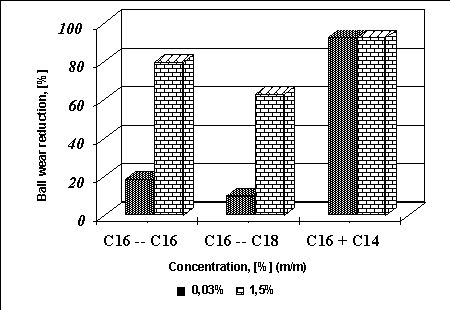 The most striking finding, clearly demonstrated in Figure 6, relates to the fact that the acid/alcohol mixtures investigated have the same effect on the steel-on-steel wear process. Their anti-wear property does not change with the concentration in n-hexadecane. Additionally, the mixtures affect dramatically the wear reduction of steel under boundary lubrication conditions. Results obtained in this work enable to state that the hypothesis saying "during the friction process under boundary lubrication conditions, lubricated by aliphatic esters, the ester hydrolysis process cannot proceed without an adequate catalyst" was proved for aliphatic esters dissolved in n-hexadecane.
