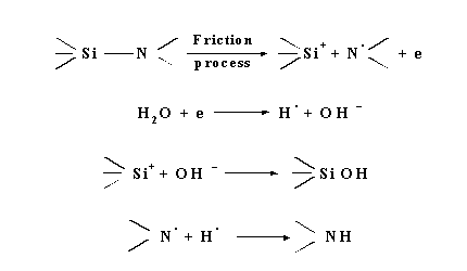 [27]. This finding is interpreted in terms of the chain matching effect with n-hexadecane. More research is needed to clarify these interactions. 6 TRIBOCHEMISTRY OF CERAMICS6.1 Silicon Nitride and Silicon CarbideAs a possible application of the NIRAM - HSAB approach for lubrication of ceramics, detailed account for tribochemical wear reactions of silicon nitride with water and alcohols was recently discussed in a review paper on tribochemistry of ceramics [28]. Usually, tribochemical reaction between silicon nitride and water to form silica is postulated via termochemical reaction process as follows: