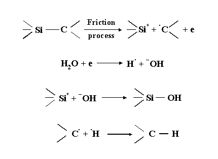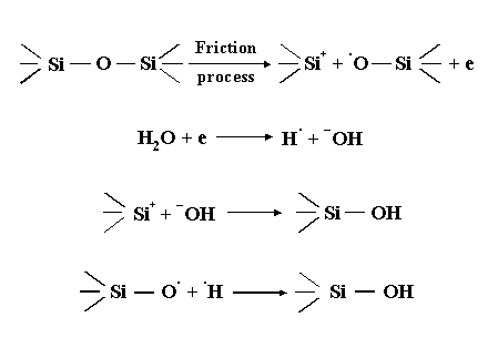 Very similar approach seems to be applicable to silicon carbide. The suggested tribochemical reaction process of silicon carbide with water under rubbing conditions is depicted in Figure 9.