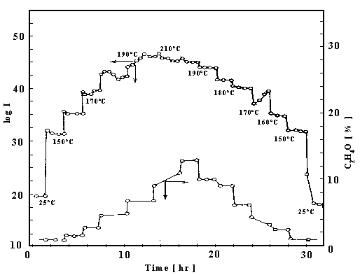 7 LINKS BETWEEN TRIBOCHEMISTRY AND CATALYSISNumerous chemical reactions relating also to catalytic processes can proceed with the same velocity at significantly reduced temperatures in comparison to the thermal reference procedure [1]. This situation is very similar to the non-catalytic thermochemical reactions and their tribochemical analogues. Therefore from the view-point of the reaction mechanism both catalytic processes and typical tribochemical reactions might relate to the same driving force -- governed by the affect of exoelectrons. Heterogeneous catalytic processes can be initiated by thermally emitted electrons. Tribocatalytic process is the typical catalytic reaction enhanced by the action of triboelectrons produced in the test system. This hypothesis can be evidenced by earlier experiments described in [3]. That work studied electron emission from silver catalyst during partial oxidation of ethylene by measuring simultaneously the emission rate and the rate of the ethylen oxide formation. Fig. 11 demostrates the effect of temperature on the emission rate of exoelectrons and on the formation rate of ethylen oxide, for which the temperature of the silver catalyst was raised step-wise from 25-210°C followed by the descent to 25°C.