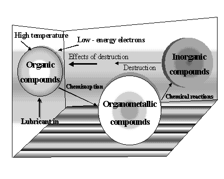 Most recent research [11] provided clear evidence that the major part of negatively charged particles emitted from diamond, alumina, and sapphire is low-energy from zero to 5 eV. This finding allows to consider the NIRAM approach as an important factor initiating typical tribochemical reactions of the environment compounds with mechanically treated solids or more specifically, being under boundary lubrication conditions. Actually, the chemical reactions under friction conditions include several types of reaction processes (i) "pure" tribochemistry, i.e. specific chemical reactions initiated only by the mechanical action of the system (mechanochemistry), (ii) reactions of thermochemical processes (e.g., oxidation, degradation), and (iii) catalytic processes related to both catalysis and tribocatalysis. The specific tribochemical reactions proceed according to both the free radical mechanism and ionic mechanism. The shearing process generates free radicals and other tribochemical reactions comprise ionic and free radical reaction types. Negative-ion-radical intermediate species are of particular interest. Therefore, some 15 years ago the negative-ion-radical action mechanism (NIRAM) approach was proposed [12-14]. Recently, this concept has been reviewed and its importance for lubricant compound reactions with the friction surfaces was presented [15]. In brief, the NIRAM approach considers the following major phases: