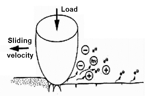 Triboemission models for tensile deformationWe identified three microscopic models that suggest a mechanism for creating triboemission from cracks that are produced by tensile deformation of oxide films or bending of single-crystal oxide films. We label these models: (i) The electrified fissure mechanism, (ii) the localized strain energy mechanism, and (iii) the recombination mechanism. In addition, we find two models that attempt to describe the statistical nature of the emission process. Since the connection between these statistical models and tribological applications is tenuous, we have not considered them in this review.Electrified fissure mechanismThe correlation between crack formation and triboemission and the absence of emission from pristine, oxide-free metal surfaces suggest that the emission may be due to surface charge created on the walls of rapidly propagating cracks. The breaking of ionic bonds in insulators by crack formation will leave opposite charge on the two sides of the opening crack. The initial expression of this electrified fissure model suggested that triboemission was a consequence of the electric field created by the separated sheets of charge, but did not provide details regarding an emission mechanism [16-18]. Dickinson et al. expanded this fissure model taking into account the interaction between the electric field created in the crack and residual gases on the crack surface [19].Strain energy at a crack tipAmott and Ramsey [20] noted that the strain energy at the tip of a propagating crack could provide the necessary energy to eject particles from the surface of a solid, but they did not suggest a specific microscopic mechanism for coupling the strain energy to an individual ejected particle. Rosenblum et al. [21] considered this model for triboemission in more detail and found that the excess strain energy at the tip, about 1/4 eV per atom, is the right order of magnitude for ejecting particles. But a microscopic mechanism for coupling this strain energy to the single ejected particle is still lacking. Rosenblum et al. found that the peak emission intensity as a function of strain did depend strongly on the thickness of the metal oxide layer and successfully explained this dependence in terms of their crack tip model of triboemission.Recombination on fractal networksA consequence of the electrified fissure mechanism for electron emission is the creation of electron-hole pairs on crack surfaces. Dickinson et al. [22] find that the decay kinetics after fracture depend strongly on the local geometry of the fracture surface. The electrons diffuse by thermally stimulated short-range hopping until trapped by defect states near the conduction band edge. The trapped electron recombines with a hole in the valence band and may emit an electron by an auger-like process or a photon by radiative recombination. These two processes for electron and photon emission can be modeled by recombination processes of the form: A + B ® C + photon/electron where A is the mobile charge and B is a trap.Triboemission models for abrasion of a surfaceThe generation of triboemission by scratching a surface is considerably more complex than triboemission generated by bending or tensile strain of a material. Processes that might contribute to triboemission from a single pass of the scribe over a surface include: plastic deformation, fracture, surface excitations, and chemical reactions between the atmosphere and freshly exposed surfaces. Additional processes that might contribute to triboemission from multiple passes of the scribe over the same wear track include: wear transitions to different modes of fracture and material removal, crushing and grinding of wear debris, and thermal load. A preliminary study of Al2O3 abraded with a diamond tip does observe a transition in the electron emission rate after multiple passes. A hypothesis is being tested that the emission transition is correlated with wear transitions in this ceramic [25,26]