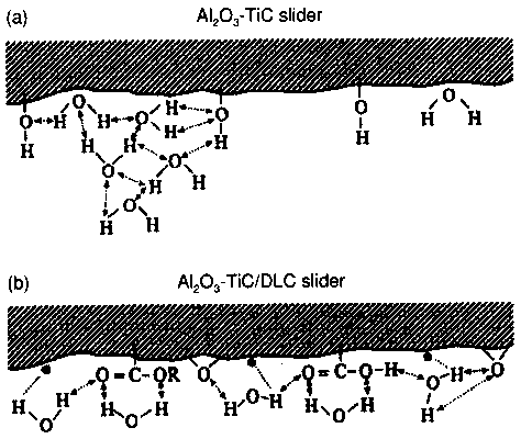 It was found that an X-1P film of 1 nm exhibits a low coefficient of kinetic friction ranging from an initial value of 0.18 to 0.36 at 2 x 105 disk revolutions. The coefficient of friction for Z-DOL, at the same thickness, is initially similar to X-1P but then increases rapidly to reach 0.7 at 7 x 10³ disk revolutions. The coefficient of friction of Z-DOL with X-1P as an additive is initially at the same value; however, it increases rapidly after 104 revolutions to reach 0.55 after 2 x 104 revolutions. Figure 2 shows that X-1P has the highest durability, followed by Z-DOL with 10 wt.% X-1P additive. Action mechanism The experimental findings described above have been accounted for by a new mechanism approach with the concept of hydrogen bonding interaction and triboemission [6]. The new mechanism was specially developed for the Al2O3-TiC surface sliding against a disk with Z-DOL lubrication at high environmental humidity. The mechanism, a speculative one, also takes into account the role of X-lP lubricant in tribological performance.