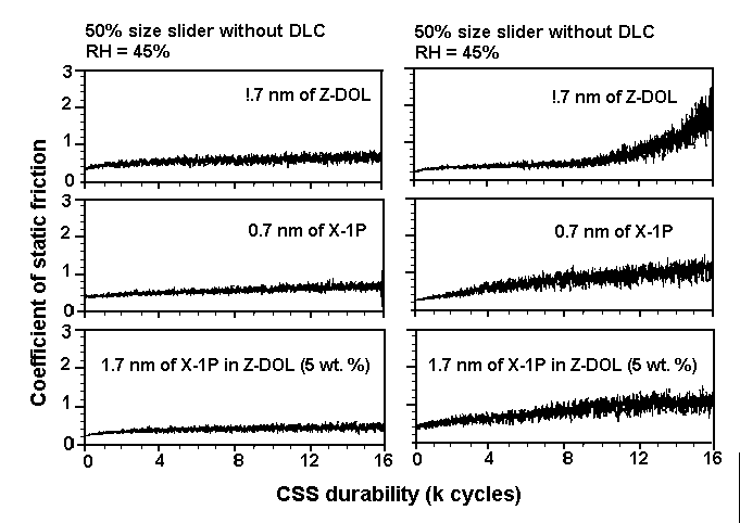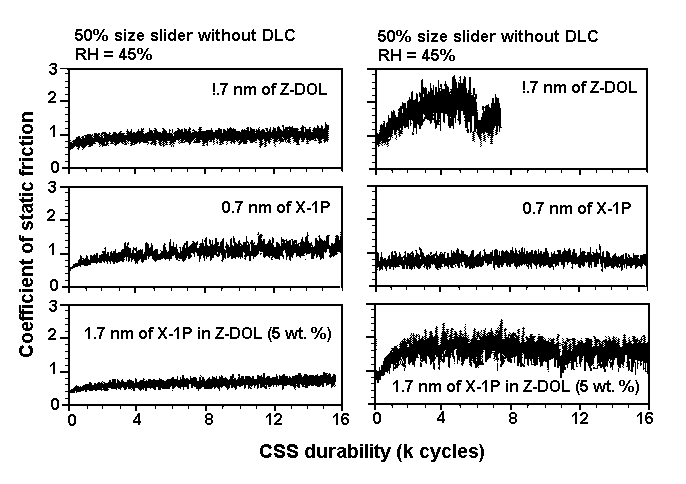 Additive-lubricant interaction with the carbon coating The interaction mechanism of the X-1P additive in Z-DOL lubricant with disk and slider surfaces has been investigated [20]. It was suggested that the X-1P molecules would lie underneath the Z-DOL molecules and next to the carbon coating. To understand the interaction mechanism better, Figure 12 compares the contact angles of similar lubricants and water on different types of solid surfaces. It can be seen that lubricant X-1P and water exhibit higher contact angles than Z-DOL and X-1P as an additive in Z-DOL. These contact angle measurements