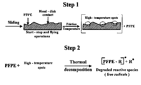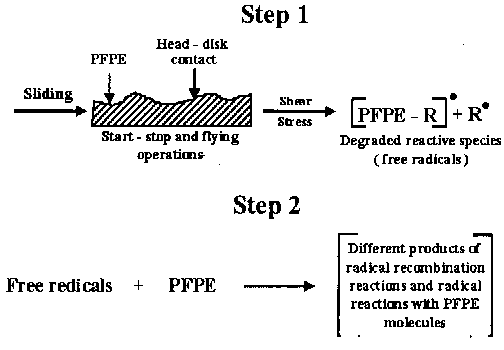 During sliding the adsorbed and chemisorbed PFPE lubricant molecules undergo degradation. Although there are a number of papers which discuss PFPE degradation mechanisms (e.g., see Zhao et al., 2000), it is still not yet fully understood. The mechanisms reported in the literature include