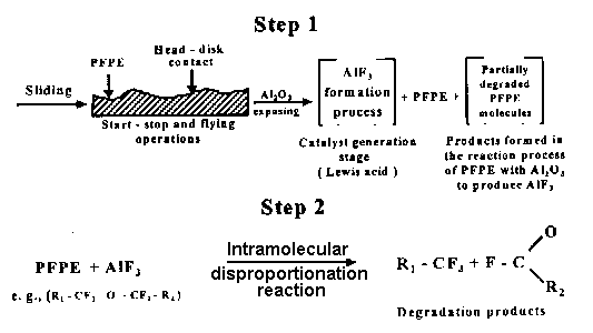 As alpha-alumina exists as the structural element in the construction of head slider for magnetic disk drive, degradation mechanism of PFPEs by a-alumina have been considered (Kasai et al., 1991). Experiments of the degradation process in the presence of AlCl3 have been conducted at high temperatures (Kasai et al., 1991; Kasai, 1999). a-Alumina is a typical Lewis acid, however. AlCl3 is stronger Lewis acid. These studies suggested that the degradation of PFPEs in the presence of Lewis acids (metal oxides or halides) is singularly dominated by the intramolecular disporportionation reaction