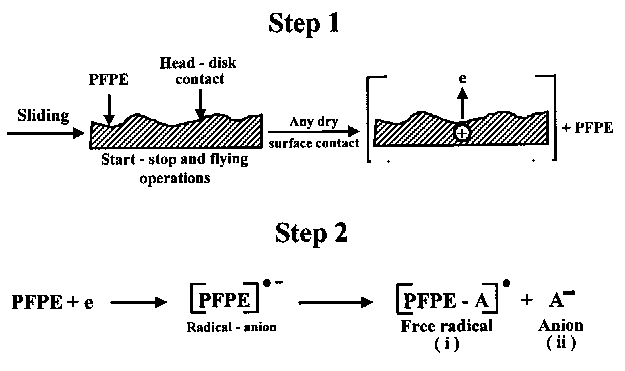 - Zhao et al. (2000) conducted head-disk interface experiments by sliding alumina-titanium carbide slider on a rigid disk with an a-C:H overcoat and PFPE film. They used an UV lamp to generate low energy electrons. They reported that the decomposition of lubricant is accelerated in the presence of the low energy electrons. This observation suggests that low-energy electron-induced degradation is a viable mechanism. Schematic presentation of the low-energy electron-induced PFPE degradation process is shown in Fig. 3.