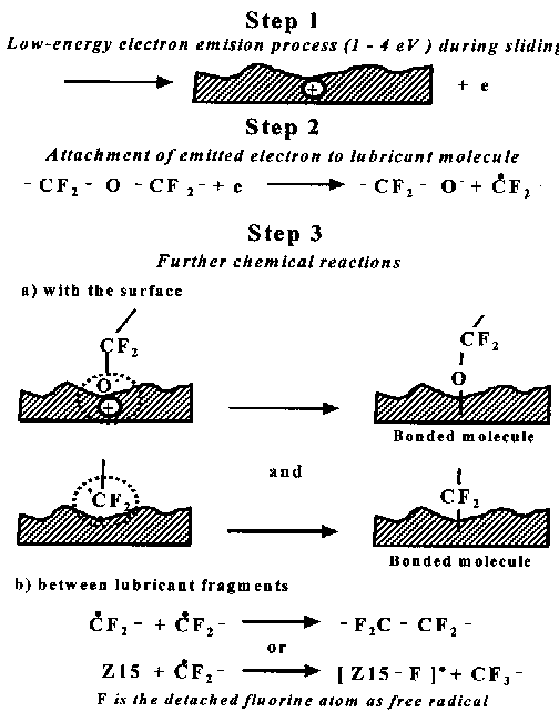 - Step 1 is similar to that in Fig. 5. The low-energy electrons then attach to lubricant molecules and form the reactive species (Step 2). The produced negative-ion reactive species allows chemical reaction with the surface and forms bonded molecules; free radical species can react with the surface dangling bonds (Step 3a). Free radicals can also recombine, forming a PFPE molecule, or they can interact with Z-15 lubricant molecules producing a smaller PFPE compound and generating another free radical [Z-15 - F]•. The latter radical can recombine with •CF2 - free radical, generating a higher molecular-weight lubricant compound. More research is needed, however, to better understand all these processes.