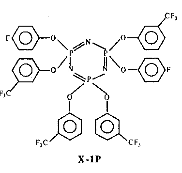 Cyklofosfazeny są związkami chemicznymi zawierającymi pierścień składający się z na przemian występujących atomów fosforu i azotu. Pierścień ten ma charakter aromatyczny. Fluoroalkoksy- i fenoksy- podstawione cyklofosfazeny o 3- i 4-członowych pierścieniach są wykorzystywane jako oleje smarowe i płyny hydrauliczne od lat 60. XX w. Są to substancje niepalne i o bardzo wysokiej odporności termicznej. W latach 90. ubiegłego stulecia NASA i Departament Obrony USA zainicjowały badania mające na celu znalezienie środków smarowych mogących pracować w wysokich temperaturach w nowoczesnych silnikach turbinowych. Substancje smarowe odpowiednie do takich zastosowań muszą mieć stabilność termiczną powyżej 360°C [L. l], być niepalne i mieć małą prężność par. Powinny przy tym zachowywać płynność w temperaturach poniżej -30°C. Spośród wielu różnych związków cyklofosfazenowych wyselekcjonowano substancję najlepiej spełniającą te wymogi. Olej X-1 P jest mieszaniną p-fluoro fenoksy- i m-(trifluorometylo)fenoksypodstawionych cyklotrifosfazenów, przy czym stosunek molowy poszczególnych podstawników wynosi odpowiednio 1:2. X-1 P jest stabilny termicznie do temperatury 430°C [L. 2]. Substancja ta posiada również bardzo dobre właściwości tribologiczne. W testach porównawczych przeprowadzonych na aparacie czterokulowym X-1 P zapewnił mniejsze zużycie kul wykonanych ze stali 52100, M-50 i SS 440 C niż olej polifenyloeterowy 5P4E.