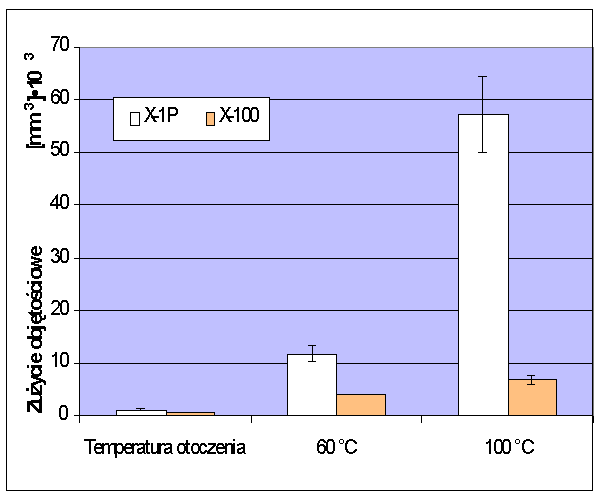 Lepsze właściwości przeciwzużyciowe oleju X-100 przejawiają się szczególnie w warunkach podwyższonej temperatury. Rysunek 4 przedstawia zużycie objętościowe dysku stalowego w temperaturze pokojowej oraz w temperaturach 60 i 100°C. Podwyższenie temperatury wpływa bardzo silnie na zwiększenie zużycia, szczególnie w przypadku oleju X-1 P. W temperaturze 60°C zarejestrowano ponad 10-krotnie większe zużycie niż w temperaturze pokojowej. Dalsze zwiększenie temperatury do 100°C powoduje aż 50-krotny wzrost zużycia. Znacznie lepsze właściwości ma X-100, dla którego wzrost zużycia nie jest aż tak gwałtowny - w temperaturze 100°C zużycie stali zwiększa się ok. 10-krotnie w porównaniu do testu przeprowadzonego w temperaturze otoczenia.
