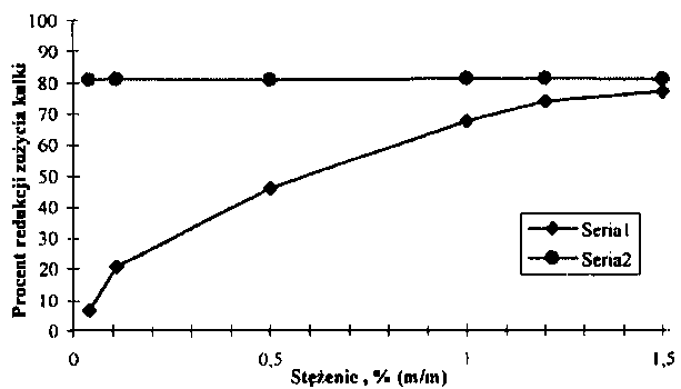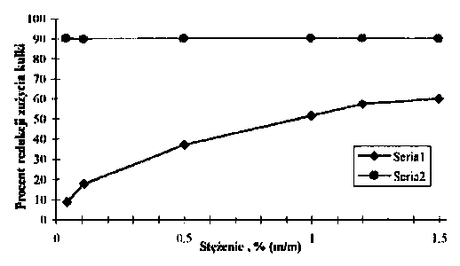 Graficzne przedstawienie uzyskanych wyników dla poszczególnych estrów i odpowiadającej im mieszaniny równomolowej kwas-alkohol podano na RYSUNKACH 2-6. Rysunki te pozwalają jednoznacznie stwierdzić, że ze wzrostem stężenia estrów palmitynowych wzrasta procent redukcji zużycia kulki, natomiast w przypadku mieszaniny kwas-alkohol stężenie nie ma żadnego wpływu na przebieg procesu zużycia kulki.