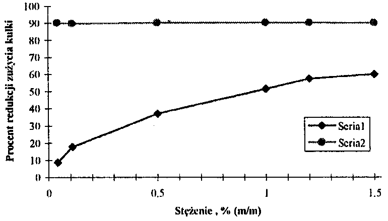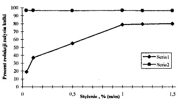 Rodzaj dodatku | Redukcja zużycia kulki w % | |