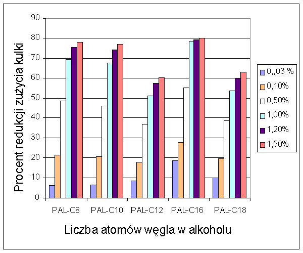 Uzyskane wyniki badań pozwalają stwierdzić, że dla estrów alifatycznych występuje tu specyficzny efekt oddziaływania międzycząsteczkowego ester-rozpuszczalnik (ogólnie olej bazowy). Specyfika ta, między innymi, przejawia się w występowaniu najkorzystniejszych warunków redukcji zużycia dla wszystkich badanych stężeli estru PAL-C16. Zależność tę ilustruje RYSUNEK 7.