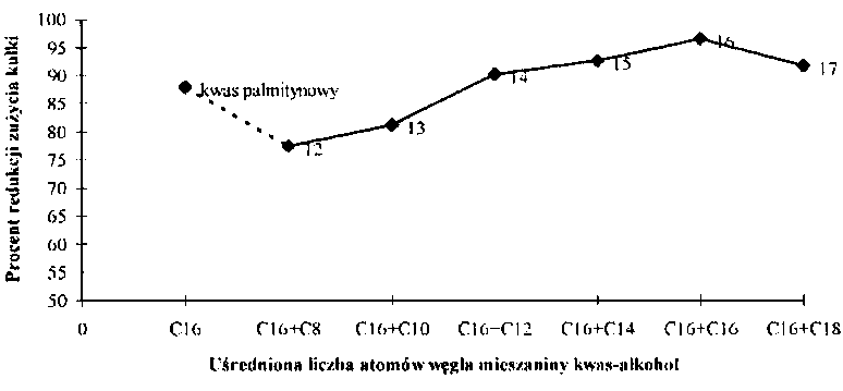 Zjawisko to chociaż bardzo interesujące, tak z punktu widzenia badań podstawowych jak i praktyki przemysłowej, nie było dotąd badane w odniesieniu do procesu zużycia tribologicznego. Pierwszą informację dotyczącą wpływu sił kohezji na przebieg procesu zużycia mieszanin alkoholi alifatycznych w n-hesadekanie opisano ostatnio w pracy [L. 10]. Występowanie minimum i maksimum redukcji zużycia układu stal-stal obserwuje się także dla mieszaniny kwasu palmitynowego i pojedynczych alkoholi, odpowiednio od C8 do C18. Z RYSUNKU 8 jest widoczne, że maksimum redukcji zużycia przypada dla równomolowej mieszaniny kwasu i alkoholu C16. Wyraźne minimum redukcji zużycia wykazuje mieszanina kwasu palmitynowego i 1-oktadekanolu. Warto przy tym nadmienić, że w odniesieniu do badania efektu kohezyjnego układu ester alifatyczny-węglowodór n-parafinowy, w literaturze nie znaleziono żadnej wzmianki dotyczącej choćby nawet współczynnika tarcia.