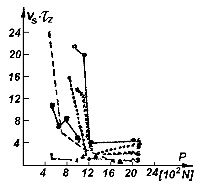 Wnioski te potwierdziła analiza zależności vs • tz = f(P) /rys. 1/. Dla wszystkich badanych olejów w zakresie prędkości ślizgania vs = 0,18 ¸ 0,38 m/s iloczyn vs • tz nie zależy od wartości przyłożonego obciążenia, a o wartości tz decydowała wartość vs. Zmiana wartości Etz, dla różnych prędkości vs jest tu więc spowodowana zmianą obciążenia, przy którym prowadzono test. W zakresie prędkości vs = 0,18 ¸ 0,72 m/s o zmianie wartości Etz decyduje prędkość ślizgania. Zmiany wartości Etz spowodowane różnicami prędkości ślizgania są znacznie większe niż ma to miejsce dla obszaru, w którym o energii Etz decyduje obciążenie. Należy więc sądzić, że prędkość ślizgania ma znacznie większy wpływ na niszczenie struktury warstwy granicznej niż przyłożone obciążenie.