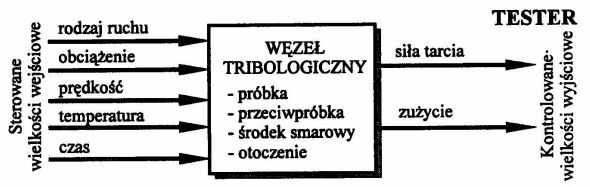 Na rysunku 2 przedstawiono typową sytuację badawczą: testowany węzeł tribologiczny (próbka, przeciwpróbka, środek smarowy, otoczenie), sterowane wielkości wejściowe (wymuszenia) i kontrolowane wielkości wyjściowe (odpowiedź układu). Według tego schematu obserwowane są rzeczywiste węzły tarcia i według tego schematu realizowane są ich badania. Zachodzi pytanie: co jest zatem przyczyną małej powtarzalności i jeszcze mniejszej odtwarzalności tych badań?
