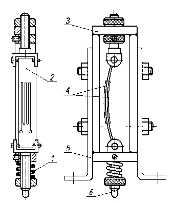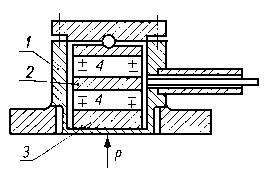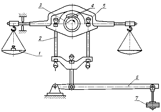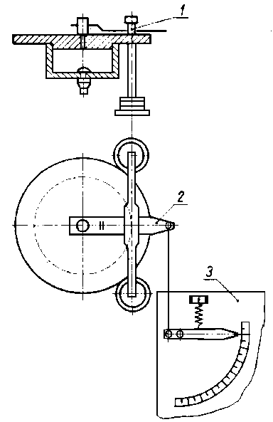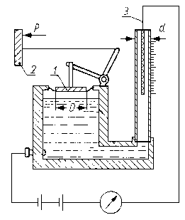 Następnie dokonuje się pomiarów zużycia w punktach 2, 3, 4 oraz w dwóch wzajemnie prostopadłych płaszczyznach I-II i II-II. Punkt 5 jest punktem kontrolnym. Jednoznaczność położeń czujnika w punktach 2, 3 i 4 zapewnia śruba mikrometryczna suportu, a w płaszczyznach I i II - specjalny ustalacz położeń. Różnica we wskazaniach czujnika w punktach 2, 3 i 4 przed i po badaniach jest miarą liniowego zużycia czopa. 9.5.8. Pomiar zużycia za pomocą dynamometrów puszkowychDo pomiaru zużycia z dużą dokładnością, w czasie trwania procesu tarcia, można wykorzystać dynamometr puszkowy. Na rys. 9.37 przedstawiono zasadę działania układu pomiarowego. Próbka 2 systemem dźwigni jest połączona z membraną dynamometru, którego korpus stanowią naczynia połączone wypełnione rtęcią. W naczyniu o mniejszej średnicy D jest umieszczony drut 3 włączony w obwód elektryczny. W wyniku zużywania się próbki układ dźwigniowy oddziałuje na membranę i powoduje wzrost słupa rtęci w rurce o średnicy d, która to zmiana wywołuje zmianę rezystancji drutu.
