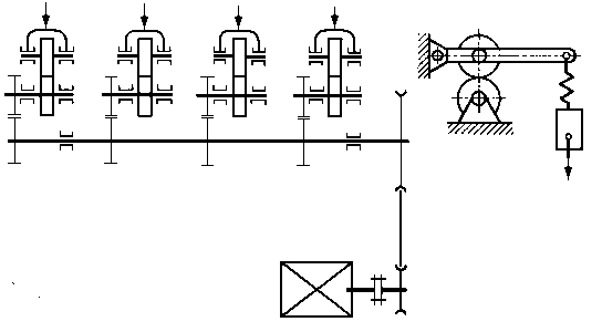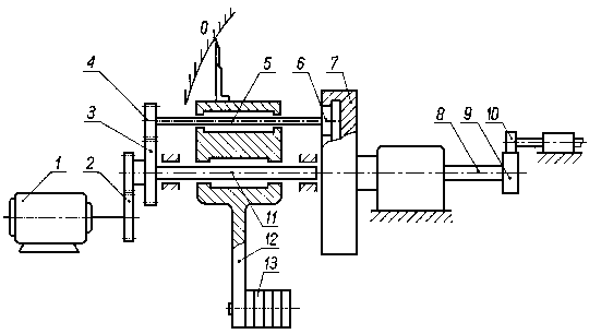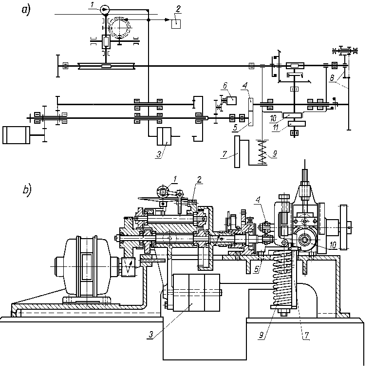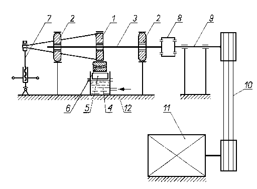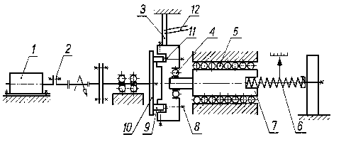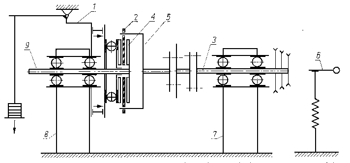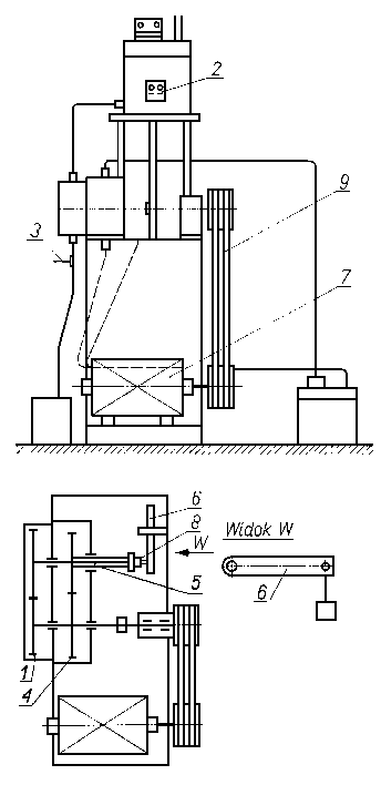 Tarcze metalowe są dociskane do tarczy ciernej za pomocą dźwigniowego mechanizmu obciążeniowego. Tuleja zębata, nasadzona ślizgowo na koniec uchwytu tarcz badanych, przytrzymuje tarczę cierną połączoną z wałkiem napędzającym. Napęd jest przenoszony na wałek napędzający od silnika elektrycznego przez przekładnię pasową. 9.6.2.12. Maszyna typu KEWAT-6 do badań trybologicznychMaszyna służy do realizacji badań podstawowych tarcia i zużycia głównie materiałów wysokociernych. Schemat maszyny przedstawiono na rys. 9.55. Silnik napędowy poprzez przystawkę napędu, umożliwiającą uzyskanie sześciu przełożeń, oraz sprzęgło kłowe napędzają wrzeciono maszyny, na którym jest umocowana żeliwna przeciwpróbka.