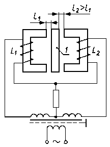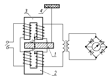 Płynący w obwodzie prąd elektryczny ulega zmianie i jest rejestrowany przez oscylograf lub galwanometr. Dokładność pomiaru zużycia wynosi ±0,2 µm. Ustawiając odpowiednio drut 3 można prowadzić badania aż do uzyskania wymaganej wartości zużycia. 9.5.9. Pomiar zużycia za pomocą czujników indukcyjnychZasadę działania indukcyjnego czujnika do pomiarów zużycia przedstawiono na rys. 9.38. Zastosowanie tego typu czujnika umożliwia ciągłą rejestrację zużycia. Przemieszczenie próbki 4 w wyniku zużycia powoduje przesunięcie kotwicy 1, skutkiem czego zmieniają się szczeliny l1 i l2 wpływające na wartość współczynnika indukcji elektromagnesów 2 i 3 w układzie mostkowym.