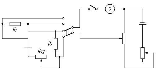 schemat takiego mostka. Jest to normalny zrównoważony mostek Wheatstone'a, gdzie R2 oznacza rezystor termometryczny, R1, R2, R3 - rezystory stałe pozostałych gałęzi, r = R3+R4 - rezystor wyrównawczy. Dla oceny zrównoważenia mostka służy galwanometr (G Równowaga mostka przy przesuwaniu suwaka r zachodzi wówczas, gdy jest spełniony warunek
