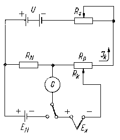 pomocniczy Jk o stałej wartości. Prąd pomocniczy jest dostarczany przez baterię U i rezystor nastawczy Rs. W chwili równości napięcia mierzonego i kompensacyjnego występuje zależność