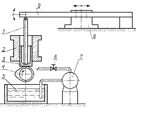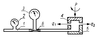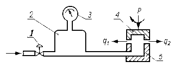 Jeżeli do otworu 2 zbliżymy ściankę 3, to ciśnienie w cylindrze będzie wzrastać, a przy oddalaniu ścianki będzie maleć, czyli zmiana odległości d między ścianką 3 a otworem 2 daje taki sam efekt, jak bezpośrednia zmiana przekroju otworu 2. Tak więc, po zmianie ciśnienia powietrza w cylindrze można sądzić o zmianie odległości między ścianką 3 a otworem 2, a przez to o wartości zużycia ścianki. 9.5.6. Pomiar zużycia za pomocą pomiaru ciśnienia i natężenia przepływu płynów przepływających przez szczelinę między trącymi elementamiMetoda oceny zużycia skojarzeń trących przez pomiar ciśnienia i natężenia przepływu płynów przepływających przez szczelinę jest oparta na zasadzie badania szczelności cylindrów silników spalinowych. Na rys. 9.31 przedstawiono schemat urządzenia do badania zużycia.