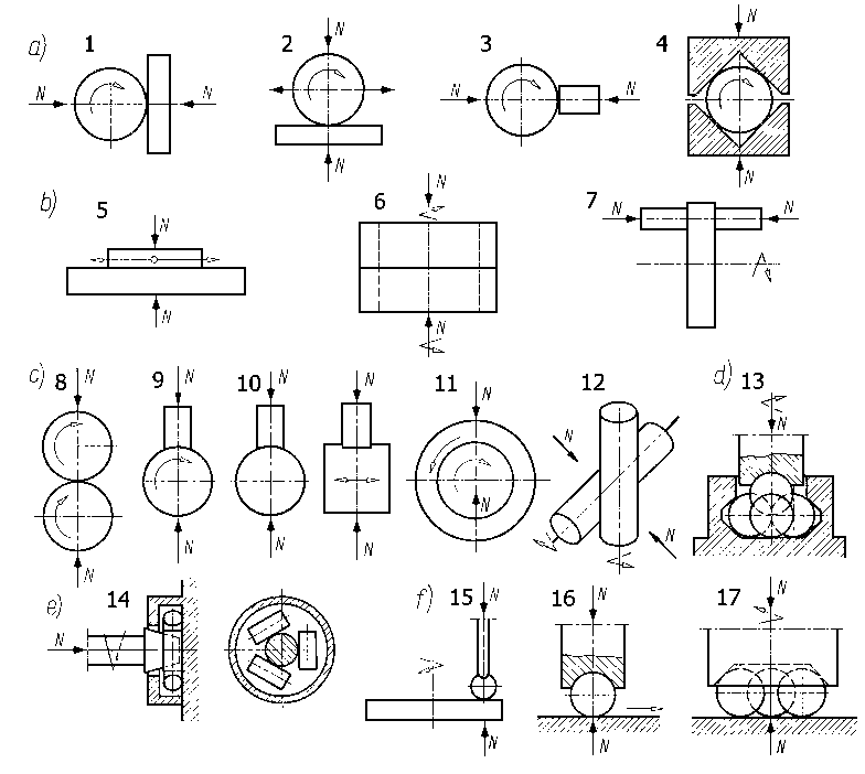 Do drugiego końca wału silnika podłączono obrotomierz 11 z licznikiem obrotów. Wrzeciono wspornika jest zakończone stożkiem z tuleją rozprężną przeznaczoną do zamocowania pierścienia - przeciwpróbki 3. Docisk próbki jest realizowany przez układ dźwigniowy 4 z symetrycznie zawieszonymi ciężarkami. Jedno z ramion układu dźwigniowego jest wsparte na wadze 5 rejestrującej wartość siły tarcia. Silnik, wspornik z wrzecionem i układ dźwigniowy dla zachowania współosiowości umieszczono na pryzmach wspólnego łoża. Próbkę 2 imitującą panewkę umocowano w uchwycie za pomocą dwóch płytek dociskanych śrubami. Obudowa uchwytu, drążona wewnątrz, ma dwie końcówki do doprowadzenia i odprowadzenia cieczy chłodzącej. Do otworu wkłada się termistor dociskany sprężyną. W dowolnej części obudowa ma sferyczne wgłębienie, którym przez kulę opiera się o płytkę oporową wykonaną z materiału izolacyjnego. 9.6.2.14. Maszyny rolkowe do badań trybologicznychPrzy badaniu zjawisk zachodzących na bocznych powierzchniach zębów kół zębatych dogodne jest zastąpić parę współpracujących zębów modelem zbudowanym z dwóch cylindrycznych rolek (rys. 9.57).