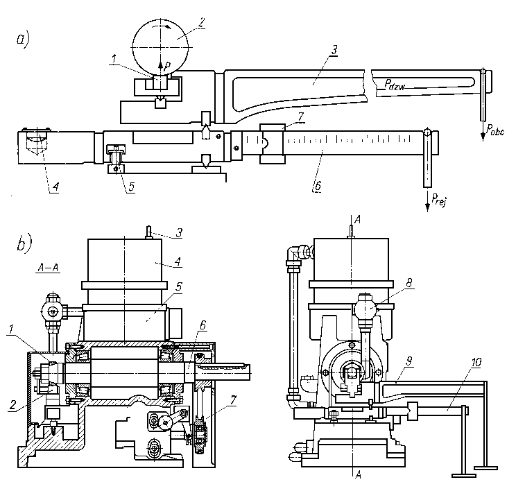 9.6.2.10. Maszyna typu KEWAT-4 do badań trybologicznychMaszyna służy do badania siły tarcia w skojarzeniu czop-panewka (rys. 9.53). Próbka 1 obraca się razem z wałkiem napędowym 7, napędzanym przez stopniową przekładnię pasową 6 i silnik elektryczny prądu przemiennego. Do próbki przez