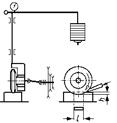 Rejestracji zużycia dokonuje się za pomocą przyrządów wskazówkowych lub samopiszących. Najczęściej stosowane są czujniki różnicowe, które charakteryzują się dużą czułością. 9.5.10. Pomiar zużycia za pomocą pomiarów tensometrycznychSchemat pomiaru zużycia przedstawiono na rys. 9.38. Do obracającej się cylindrycznej próbki l jest dociskana przeciwpróbka zamocowana do belki. W miarę zużywania pary trącej belka przemieszcza się ku dołowi i powoduje odkształcenie belki tensometrycznej umieszczonej między podstawą a belką. Sygnał z tensometrów jest zapisywany przez rejestrator.