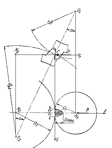 gdzie: P - siła docisku, ν1, ν2 - liczba Poissona dla materiału koła pierwszego i drugiego, E1, E2 - moduły sprężystości materiałów koła, pierwszego i drugiego, ρ1, ρ2 - promienie krzywizn zarysów zębów koła pierwszego i drugiego w rozpatrywanym punkcie.