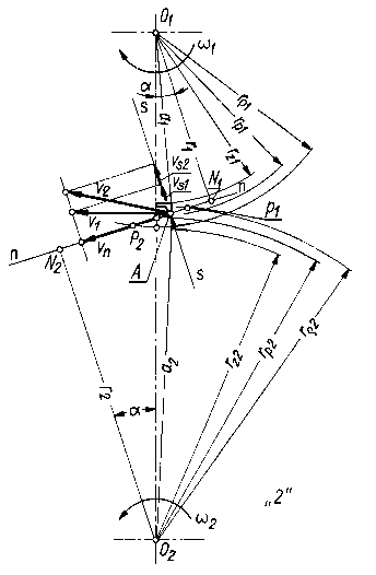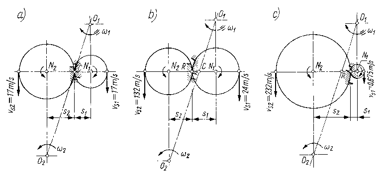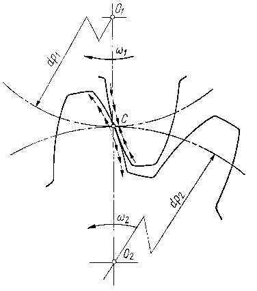 Kierunki ślizgania po sobie zarysów zębów są skierowane odśrodkowo względem punktu centralnego C zarysów zębów dla koła czynnego i dośrodkowo dla zębów koła biernego (rys. 9.61).
