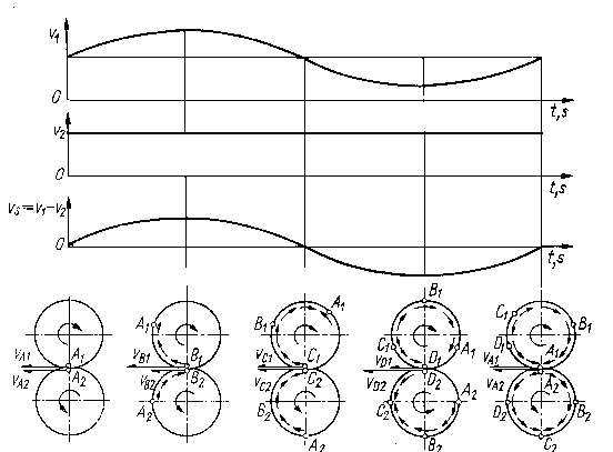 Po upływie 1/4 okresu T punkt A1 obróci się o większy kąt niż punkt A2, co wynika z różnicy prędkości w tym okresie. Po upływie 1/2 okresu T prędkości obydwu rolek znów są jednakowe. Na rys. 9.63 strzałki wskazują kierunki poślizgu. Należy zaznaczyć, że obszary punktów C1 i A2, modelują pracę zęba koła czynnego, a obszary punktów A1 i C2, - pracę zęba koła biernego.