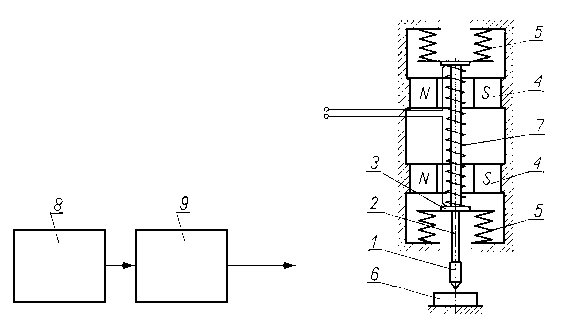 9.6.2.18. Maszyna bijnikowa ze wzbudnikiem drgańMaszyna służy do badania wpływu rodzaju oleju na pitting. Maszyna (rys. 9.75) składa się ze wzbudnika drgań, generatora 8 i wzmacniacza mocy 9. Generator 8 wytwarza drgania sinusoidalne o określonej amplitudzie i częstotliwości. Amplituda sygnału wychodzącego z generatora 8 jest wzmacniana przez wzmacniacz prądu przemiennego 9. Sygnał ze wzmacniacza steruje pracą cewki wzbudzającej 7 umieszczonej na korpusie wałka. Zasada działania wzbudnika elektromagnetycznego opiera się na oddziaływaniu pola magnetycznego magnesów stałych 4 na umieszczoną w nim cewkę 7 zasilaną prądem przemiennym. Wałek wraz z zamocowaną na nim cewką jest zawieszony na dwóch sprężynach. Drgania odbywają się wokół położenia równowagi wynikającego z napięcia sprężyn. Drgający wałek jest zakończony bijnikiem 7 w postaci wciśniętej weń kulki. Kulka w czasie pracy wzbudnika uderza o nieruchomą próbkę 6 wymuszając obciążenie okresowe.